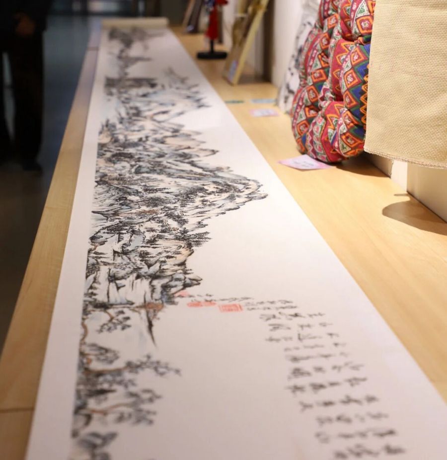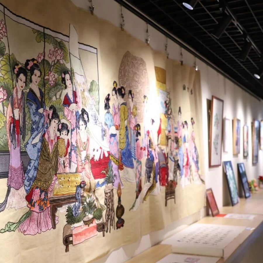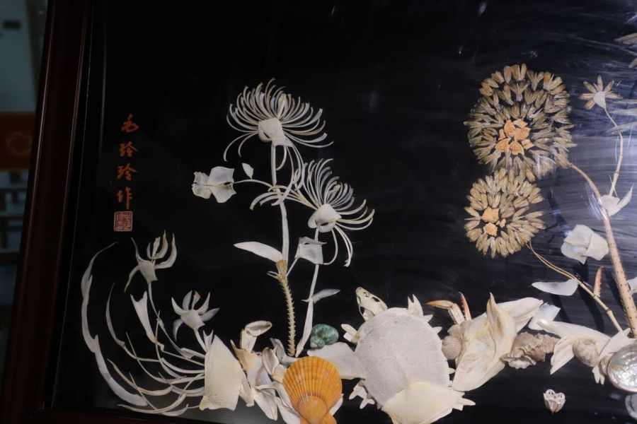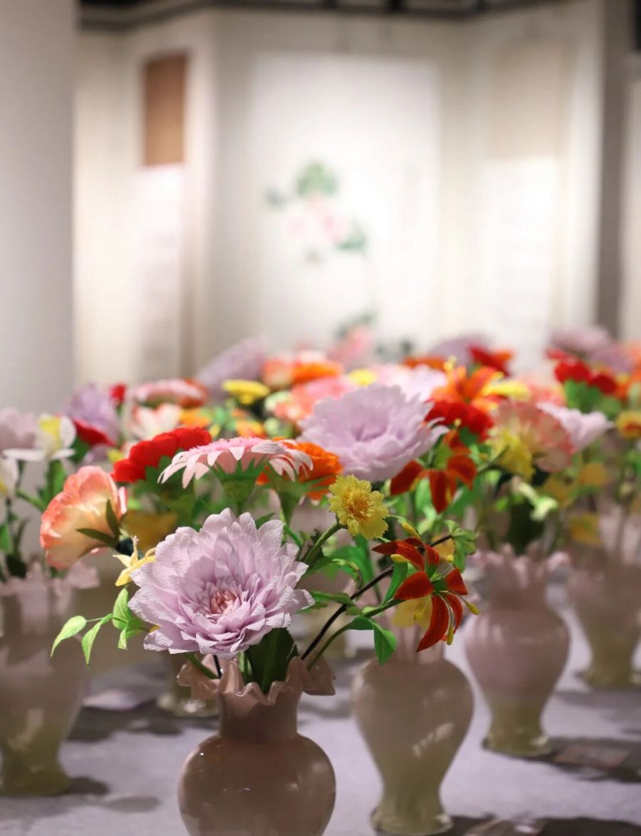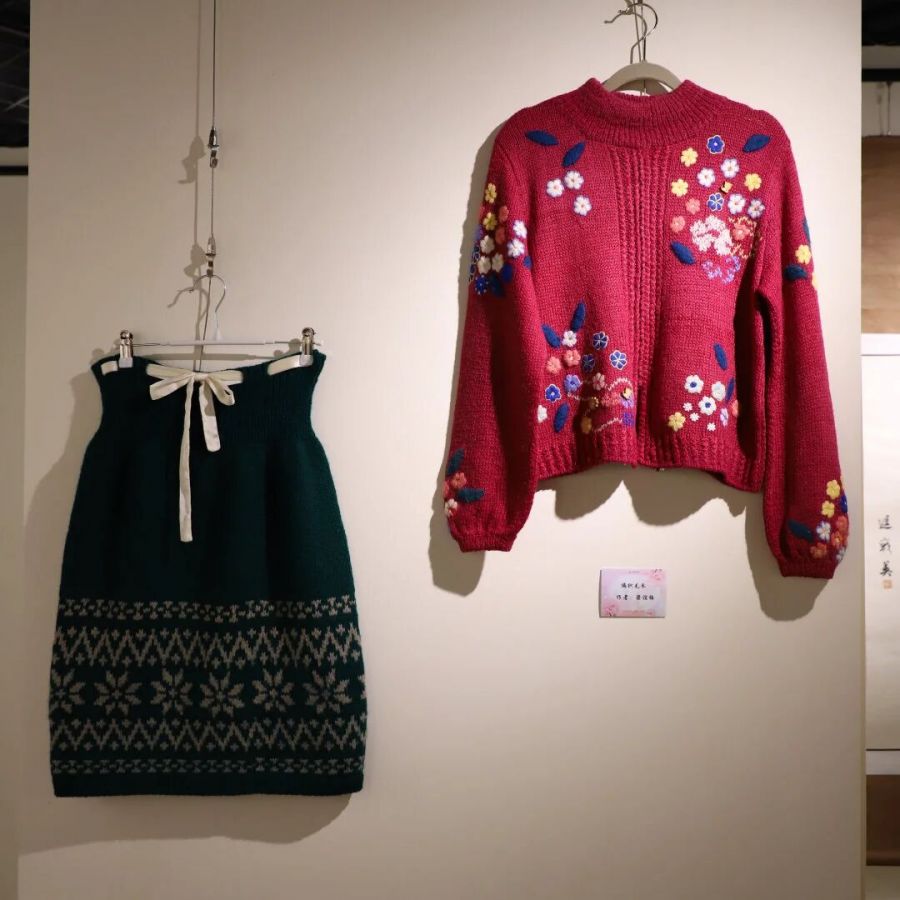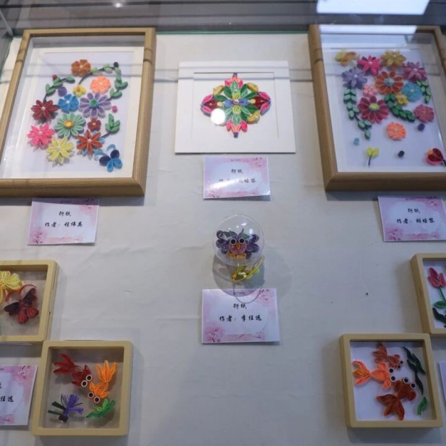 一幅临摹《富春山居图》的长卷,一对笑容可掬的泥塑小俩口,一件绣花的手工毛衣+提花筒裙,还有那些小巧别致,即像中式盘扣又像漂亮糖果的衍纸,精美的宋锦珍珠画,相框创意插花,呈现着十八位古代仕女的巨幅十字绣,由16束皱纹纸花汇成的花的海洋……琳琅满目,数不胜数。